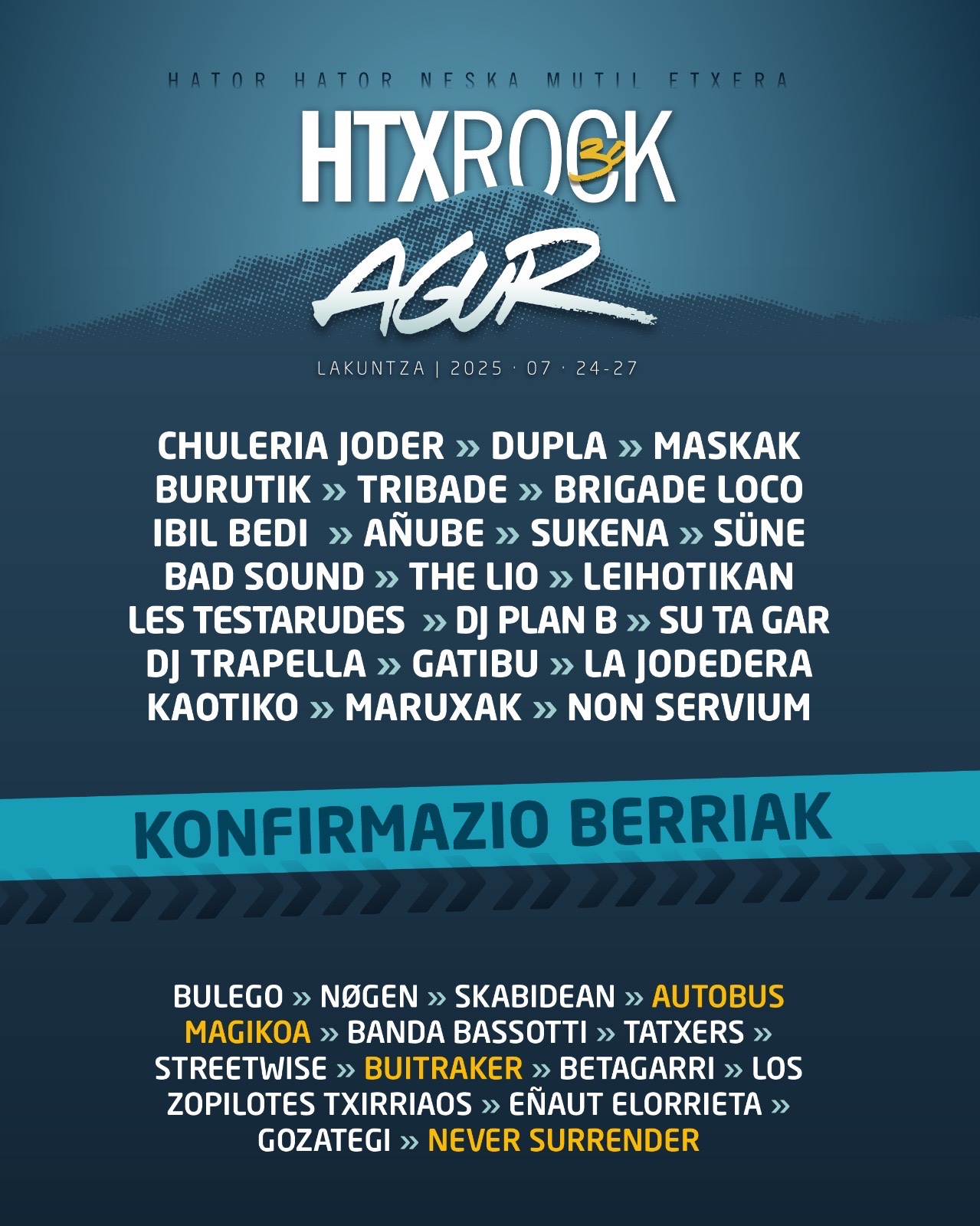 Anestesia, ZETAK, Delirium Tremens, Barniz, Bizardunak, Deskontrol + Arkada Social, Reincidentes, Kaleko Urdangak, KOP, Zea Mays, Las Ninyas del Corro, Mirua, Potato, Nafarroa 1512, Naxker, ødei, Odolkiak Ordainetan, Svetlana, On, Talco, Juantxo Skalari & La Rude Band + Set Skalariak, Xiberoots, Xutik eta Zaunka taldeak izanen Lakuntzan uztailaren 24tik 27ra ospatuko den azken HTX jaialdian.