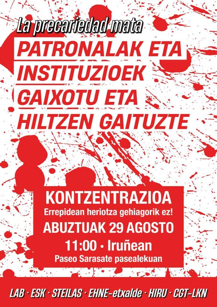 LAB, ESK, STEILAS, EHNE, Etxalde, Hiru eta CGT-LKN sindikatuek elkarretaratzea eginen dute ostiralean goizeko 11.00etan Sarasate Pasealekuan.