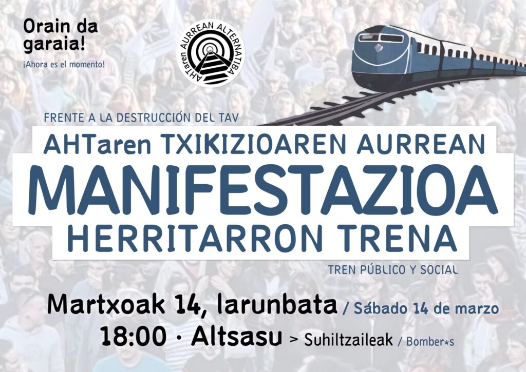 "Gure bailarak arrisku bizian daude. AHTa gure lurraldea txikitu, erdibitu eta betirako baldintzatuko lukeen proiektu ez jasangarria da", diote protestaren deitzaileek. Tren soziala, eraginkorra eta eskualdea hiriburuekin lotuko duena aldarrikatuko dute.