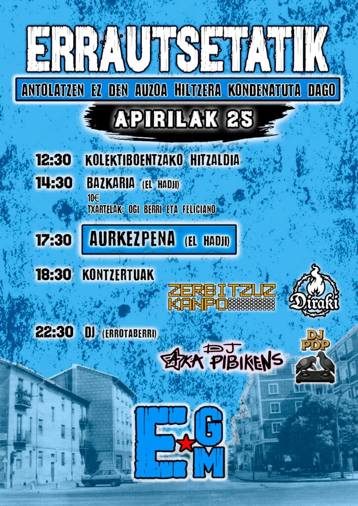 Bere aldetik, Errotxapeako Gazte Mugimendu berriak bere ekimena aurkeztuko du gaur “Errautsetatik” leloa hartuz. Egunean zehar hainbat ekimen prestatu dituzte, eta eguna kontzertuekin amaituko dute.