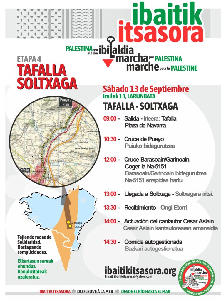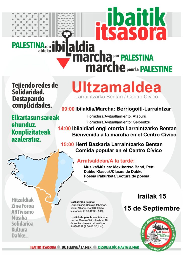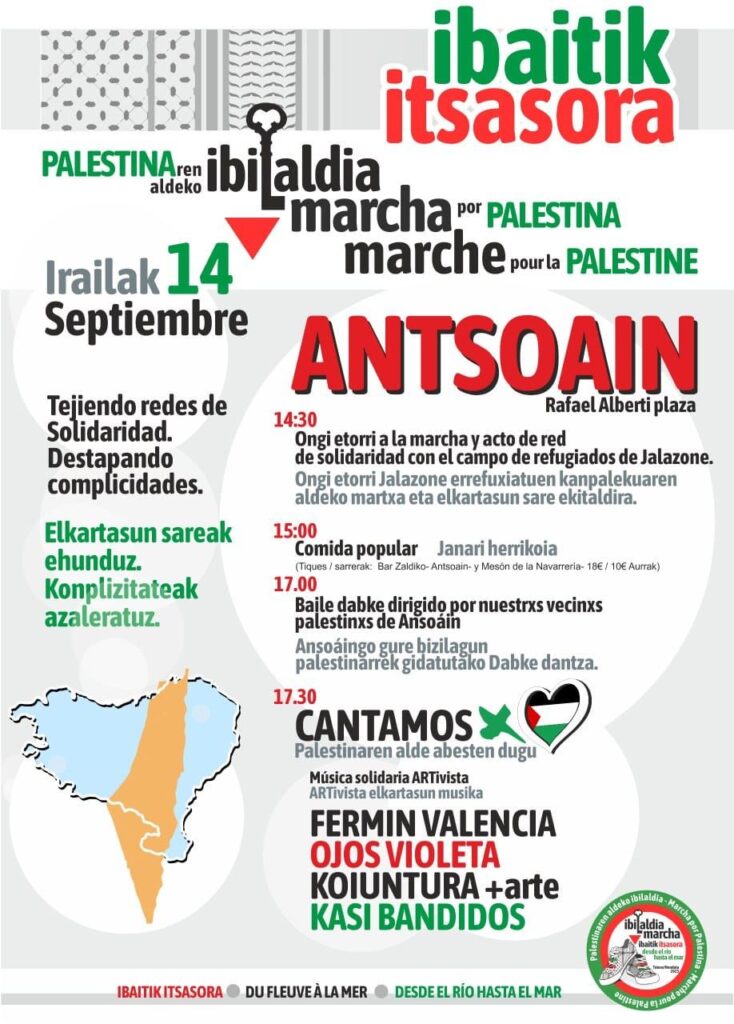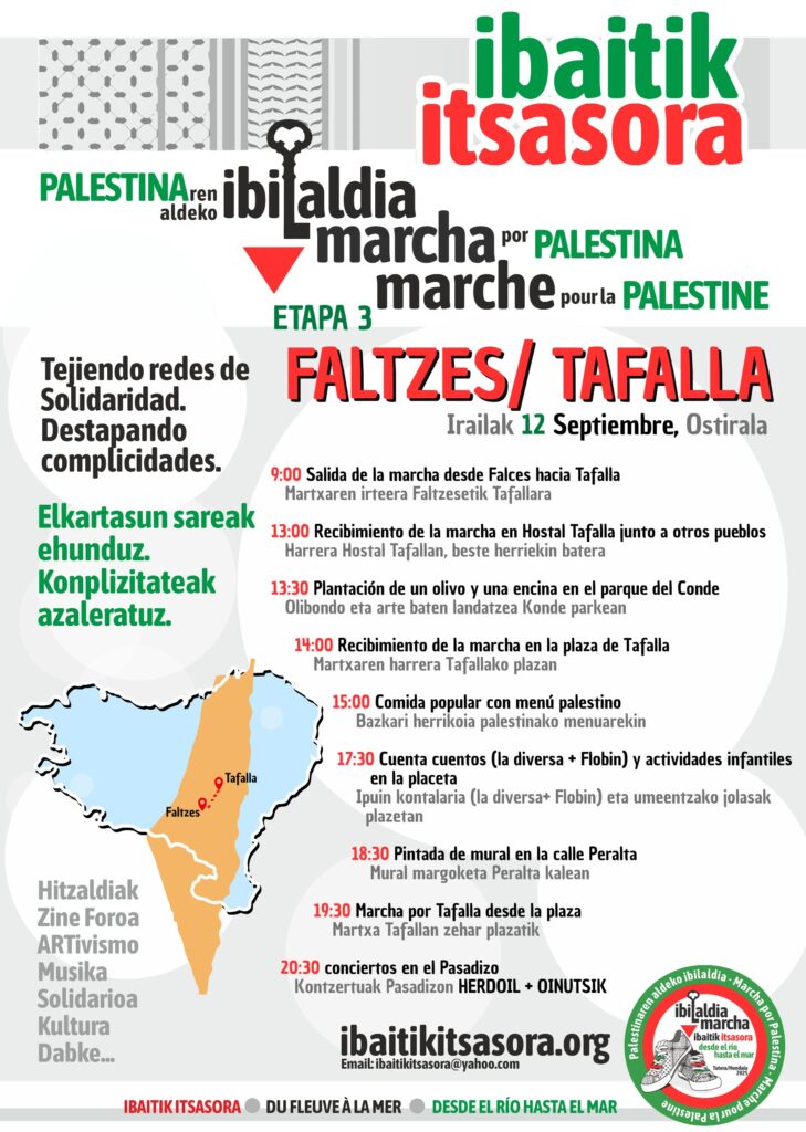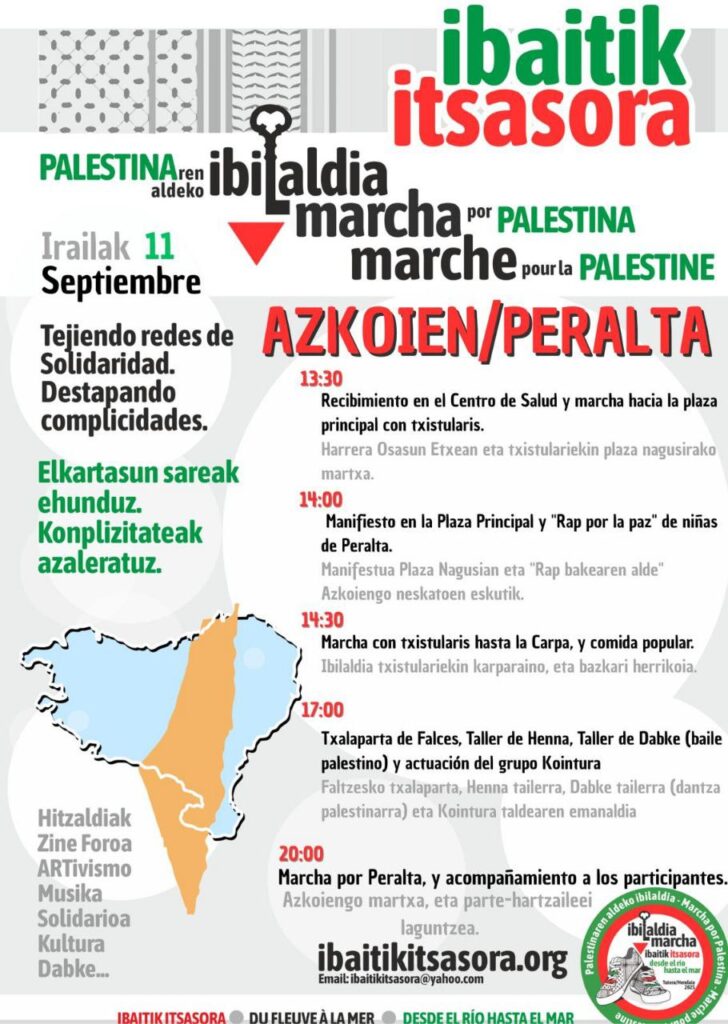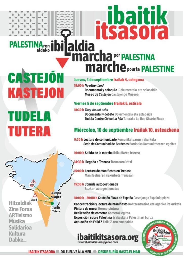 Irailaren 10etik 20ra “Ibaitik itsasora” ibilaldiak Tuterako Ebroren ertzetatik Hendaiako itsasoraino igaroko du Nafarroa zeharkatuz. Palestinak “askatasuna, berdintasuna eta justizia” izateko eskubidea duela “bere lurralde historikoan, Jordan ibaitik itsasoraino”. Eta Euskal Herriak asmo horri ematen dion babesa irudikatu nahi dute ibilaldi honekin.