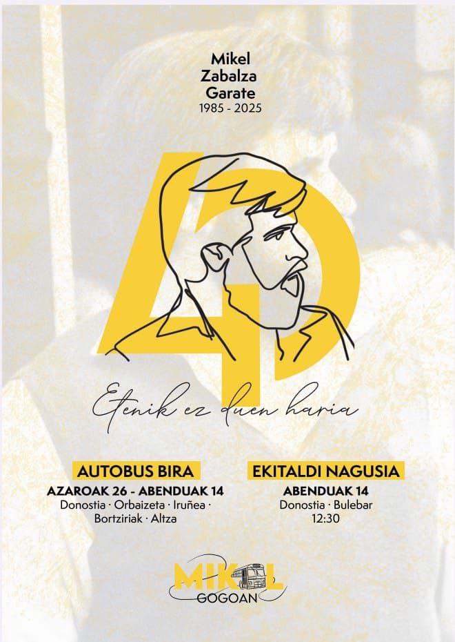 Altzako, Aezkoako eta Bortzirietako herri ekimenak, DBuseko langileak, Torturatuen Sareak eta Egiari Zor fundazioak Mikel Zabalza 40 urte gogoan egitasmoaren zehaztapenak eman dituzte gaur Donostian egindako agerraldi baten. Azaroaren 26tik abenduaren 14ra, Mikel Zabalza desagerrarazi zutenetik Bidasoa ibaian agertarazi zuten egunera arteko datetan Aezkoa, Erroibar, Auritz, Agoitz, Iruñea, Bortziriak, Altza eta Donostia lotuko duen Autobus Biraren nondik norakoak azaldu dituzte.