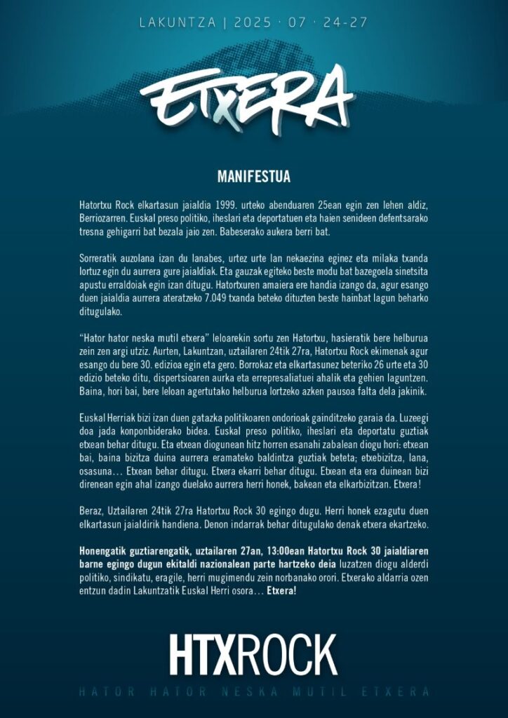 Guzti hauek jaialdiak aurkeztutako manifestua sinatu dute. Bertan, gogora ekartzen da zergatik jaio zen Hatortxu Rock: «Euskal preso politiko, iheslari eta deportatuen eta haien senideen defentsarako tresna gehigarri gisa» sortu zela nabarmentzen da, baita auzolana izan duela lanabes gauza handiak egiteko aukera emanaz.