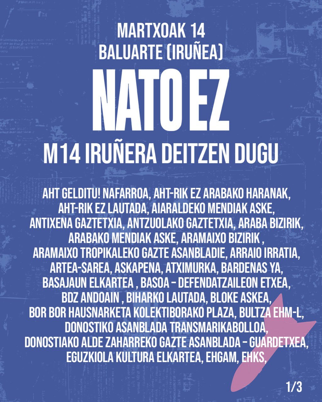 Gaur egun, populazioaren parte bat errepresioaren, kartzelaren eta askatasun faltaren mehatxupean bizi da, eta amaiera jarri behar zaio egoera honi. Horregatik, bestelako Nafarroa baten alde, eskubide zibilen eta pertsona guztien askatasun politikoak errespetatzen dituen Nafarroaren alde, igandean motxila ilusioz beteko dugu.
