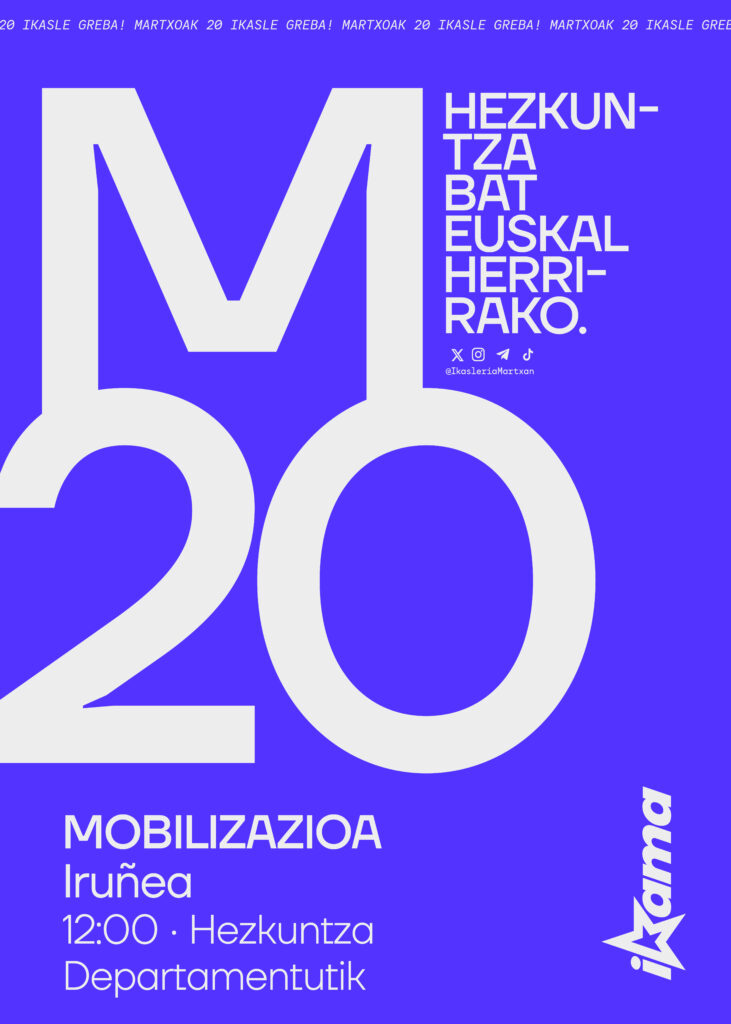 Ikama ikasle antolakundeak Hego Euskal Herriko ikasleei kalera ateratzeko deia luzatu die martxoaren 20an, Euskal Herrirako hezkuntza propio baten beharra aldarrikatuz. Abenduan ezagutzera eman zuten Ikamaren proiektu politiko berria, Euskal Hezkuntza Sistema Publiko eta Komunitarioa hain zuzen ere.
