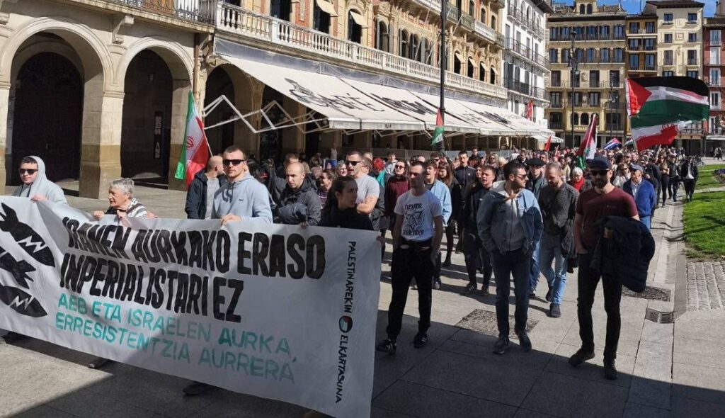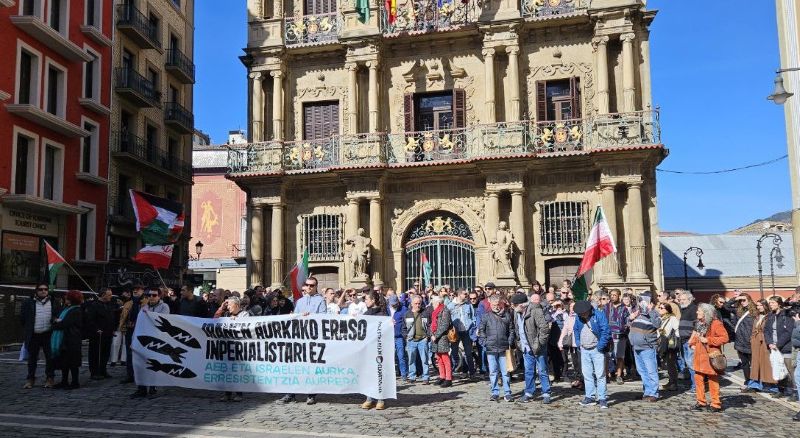 Israelek eta Amerikako Estatu Batuek Iranen aurkako erasoa oraindik martxan dagoen honetan, Euskal Herrian lehenengo protestak izan dira. Iruñean, Palestinarekin Elkartasuna ekimenak deituta, manifestazio bat egin da gaur eguerdian. “Eskolak eta azpiegitura zibilak erasotu zituzten, Irango gobernuaren ministeritzak eta lider gorenaren bulegoak jopuntuan jarri zituzten eta lider gorena erahil zuten, Irango agintaritza ezabatzeko asmoz”.