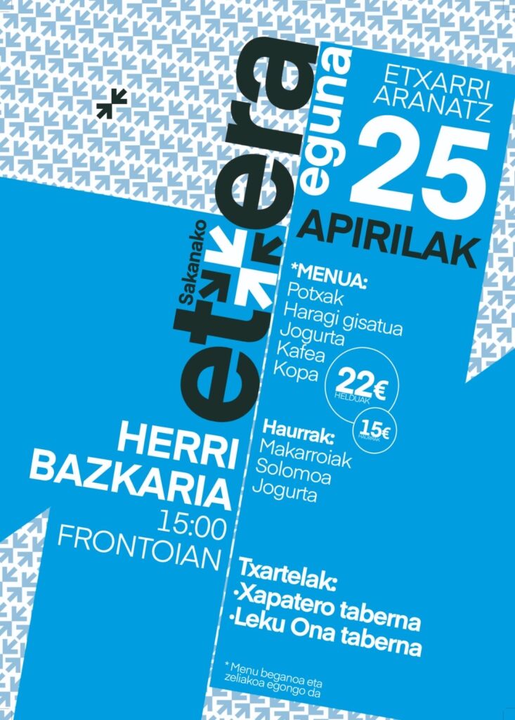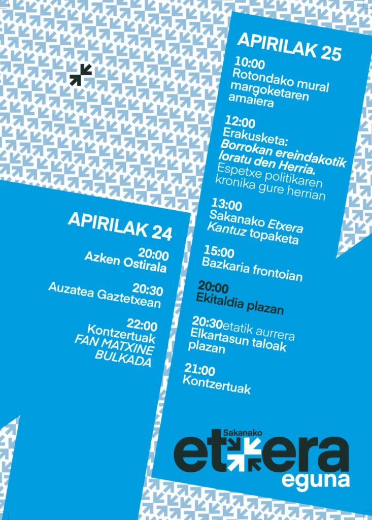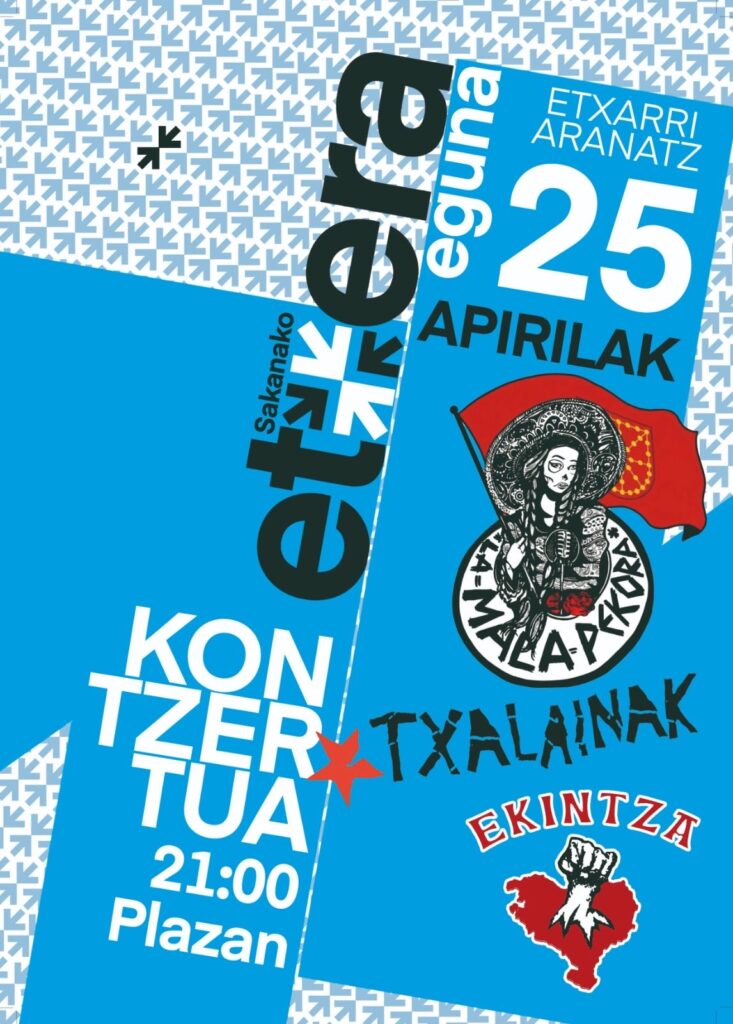 Sare Herritarrak antolaturik, asteburu honetan Etxera Eguna ospatuko da Etxarri Aranatzen. Aurretik egindako deialdi honekin oraindik ere herrian geratzen diren bi preso politikoen eskubideen errespetua eta haien etxeratzea aldarrikatuko da. Egoera ikusita, Sarek asteburu honi begirako deialdia indartu nahi izan du. Ostiralean Fan Matxine eta Bulkada taldeak arituko dira Gaztetxean. Larunbatean, berriz, goiz goizetik hasiko dira jarduerak. Goizeko 10.00etan mural margoketa eginen da, 12.00etan erakusketa bat ikusteko aukera izanen da, 13.00etan kantatzeko ordua izanen da, eta 15.00etan herri bazkaria eginen da. Arratsaldeko 20.00etan ekitaldia izanen da eta ondoren taloak jateko eta kontzertuak izanen dira. Mala Pekora, Txalainak eta Ekintza taldeak igoko dira oholtzara.