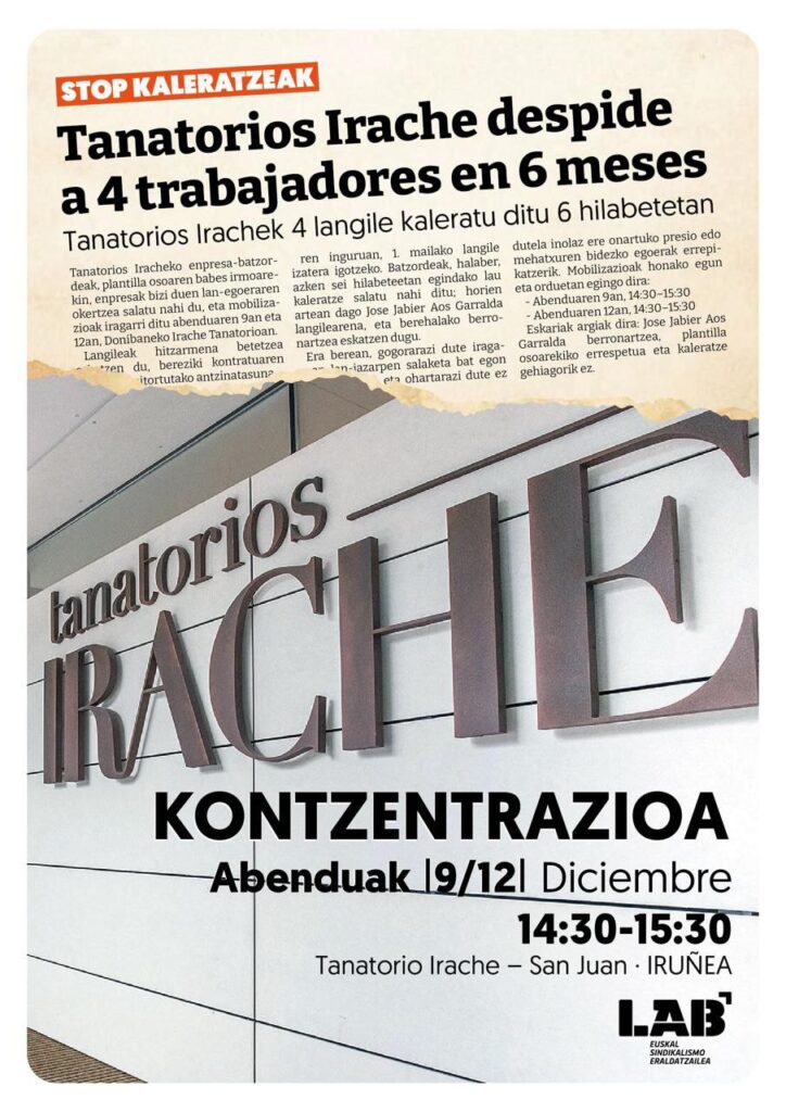 Las trabajadoras y los trabajadores de Tanatorios Irache denuncian que la empresa ha despedido al 11,43% de su plantilla en apenas seis meses, una situación que califican de insostenible y que refleja, según afirman, un deterioro del clima laboral.