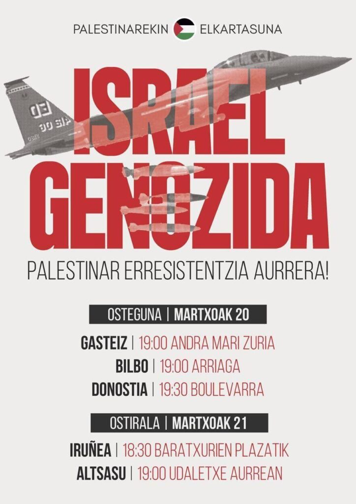 Por otro lado, la iniciativa Gernika-Palestina ha convocado una manifestación nacional el sábado en Donostia, de la que dará más detalles mañana jueves, pero ya han adelantado que partirá a las 17.30 desde el Boulevard bajo el lema “GENOZIDIOA STOP! Israel, ¡alto el fuego ya!”.