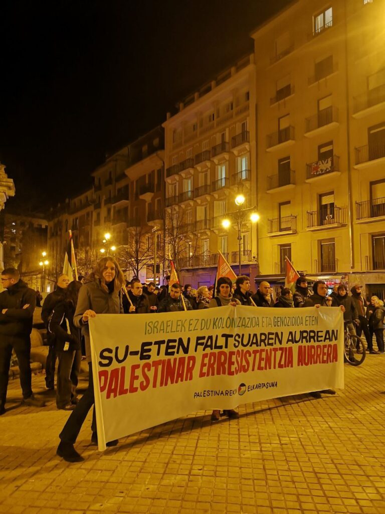 NBEk partizio plana sinatu zuenetik 78 urte bete direnean, eta bi estatuen “irtenbide faltsua” salatzeko elkarretaratzeak egin ditu Palestinarekin Elkartasuna Euskal Herriko hiriburuetan eta hainbat herrietan asteburuan zehar. Nafarroan, Iruñean eta Altsasun izan dira mobilizazioak. Horietan su etena faltsua dela eta palestinar erresistentziari babesa eskaini diote.