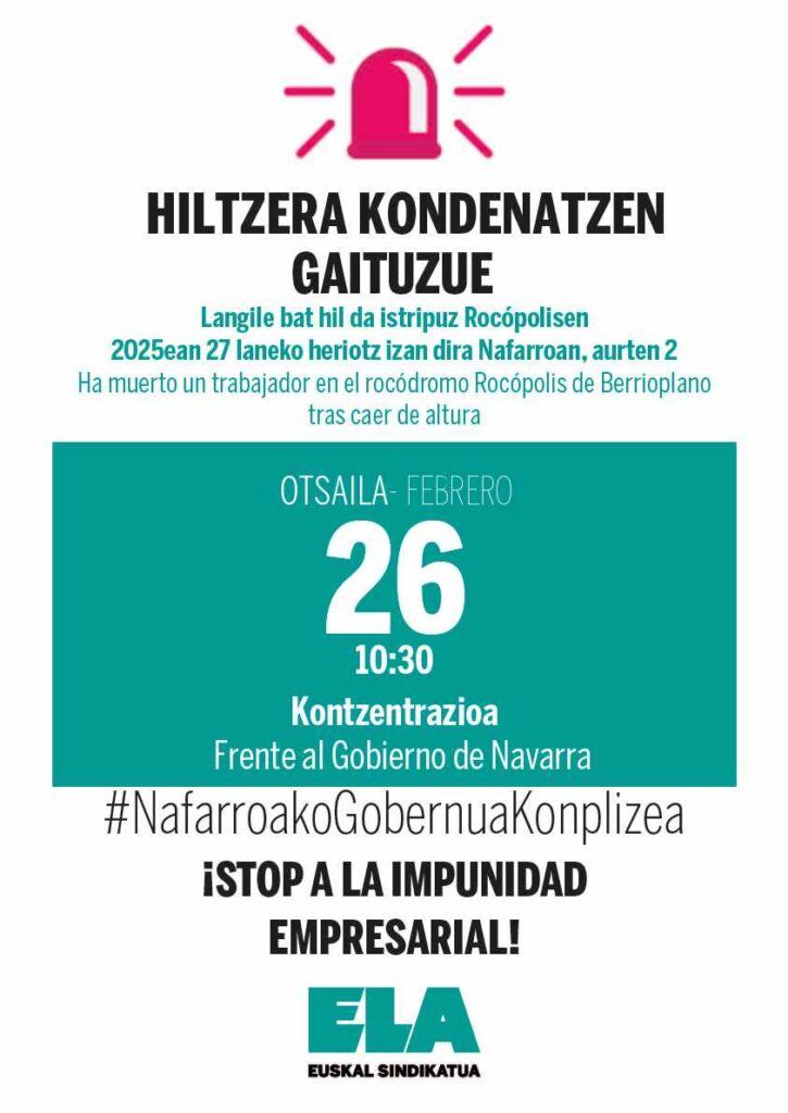 Aurten, honez gero 7 pertsona hil dira euren lanpostuetan Hego Euskal Herrian, azkena atzo bertan Lantaronen (Araba), leherketa baten ondorioz. Nafarroan, altuerako erorikoak dira oraindik ere laneko heriotzen arrazoi nagusietakoa “babes-neurri egokiekin erraz saihestu daitezkeen arren”. ELAk salatu duenez, enpresariek “ez dute prebentzio-araudia betetzen, eta erakunde publikoek uko egiten diotela hori kontrolatzeko bitartekoak handitzeari”.