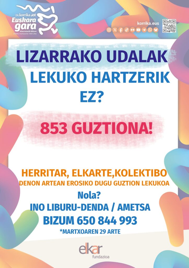 “Udala gertuen dugun erakundea da eta horregatik eskatzen diogu herritarrek horren gogotsu eta urte luzez bultzatzen duten ekimenari babesa adieraztea”, azaldu du Lizarrako Korrika Batzordeak, eta Udalari zegokion kilometroa erosteko diru bilketa egin dute.