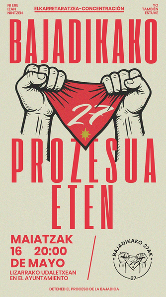 Maiatzaren 22tik 23ra bitartean deklaratu beharko dute auzipetuek. Gazteek salatu dute instituzioak "geroz eta gehiago" ari direla mugatzen protestarako eta mobilizaziorako eskubide politikoa, eta 'Bajadikako 27ak' izenarekin sortu dute plataforma bat. Maiatzaren 16an elkarretaratzea egingo dute Lizarrako udaletxe aurrean, arratsaldeko 20:00etan.