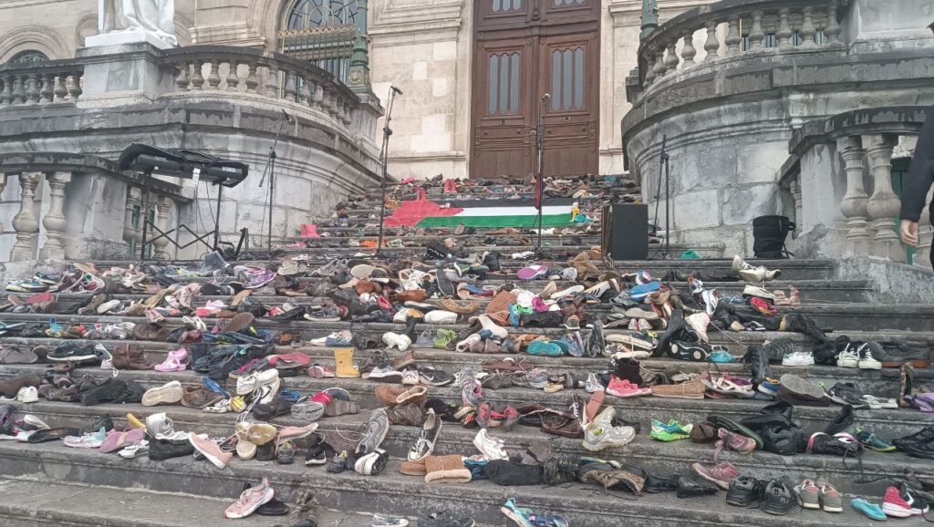 Plaza Zirkularrera iritsi ostean, udaletxerako bidea hartu du manifestazioak. Han, ezohiko irudia zuten zain manifestariek: udaletxeko eskaileretan ehunka zapata huts zeuden, Israelek hildako umeak irudikatzeko. Ekitaldia amaitzeko, pailazoen parte hartzea eta musika emanaldiak izan dira.