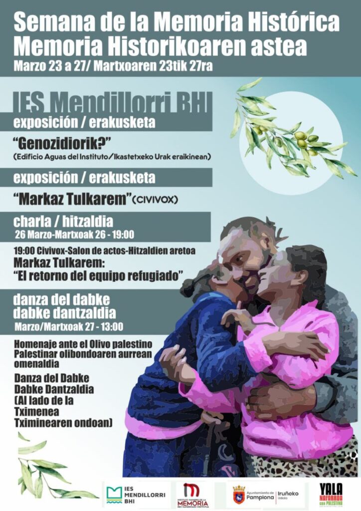 Era berean, jakinarazi nahi dugu ostiral honetan, Mendillorrin, Iruñeko Udalak Palestinaren aldeko lorategi bat inauguratuko duela, Yala Nafarroak pasa den urtean egindako proposamen bati erentzuna emanez. Ekitaldi horretan Mendillorriko institutuko ikasle eta irakasleek parte hartuko dute; egun hauetan, memoriari buruzko jardunaldiak egiten ari direnak.