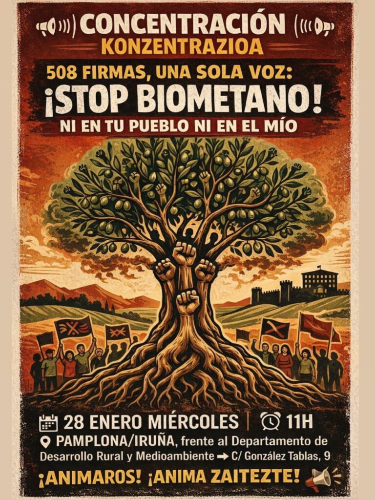 Finalmente, la Plataforma Stop Biometano de Sesma realizará el próximo 31 de enero, a partir de las 18:00 horas, una charla informativa con la participación de la Fundación Sustrai Erakuntza. Si finalmente no se autoriza el uso de una sala municipal, la charla se realizará en la calle.