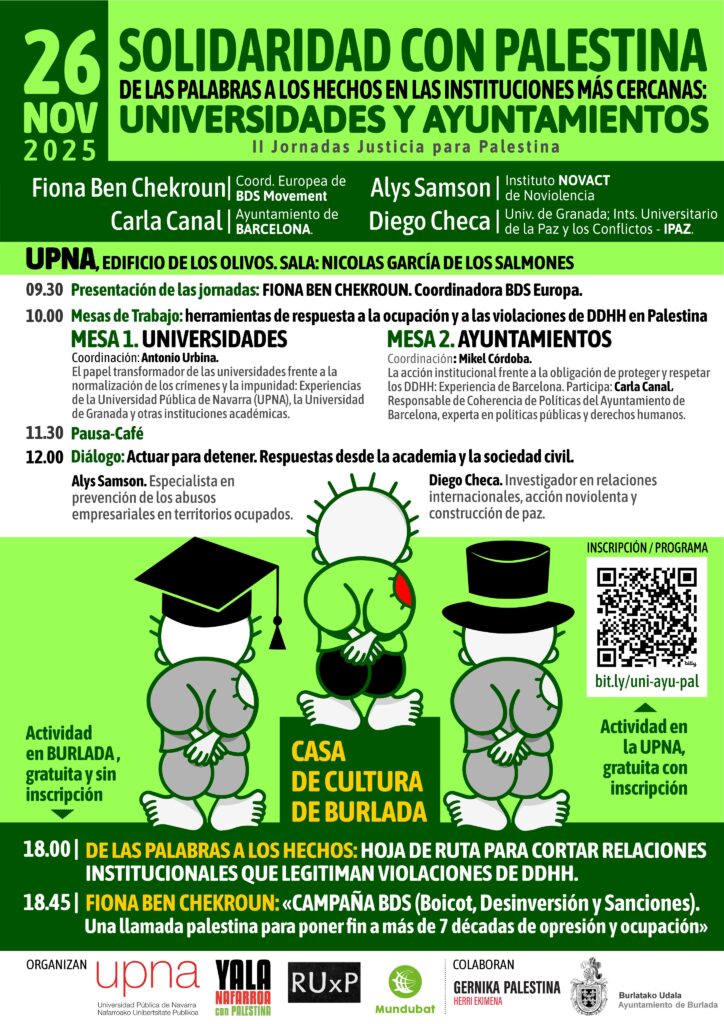 Esta misma semana, Yala Nafarroa celebrará más actos centrados en denunciar la situación en Palestina. En una conferencia que reunirá a expertos y personas relacionadas con la denuncia del genocidio en Gaza, Yala tratará de afianzar los compromisos solidarios con el pueblo palestino y de implantar acciones de boicot y aislamiento para el Estado sionista. Las jornadas darán comienzo el 26 por la mañana en la UPNA y comprenderán diferentes conferencias y talleres. Ya por la tarde, la Coordinadora europea de la campaña BDS Fiona Ben Chekroun ofrecerá una conferencia en la Casa de Cultura de Burlata.