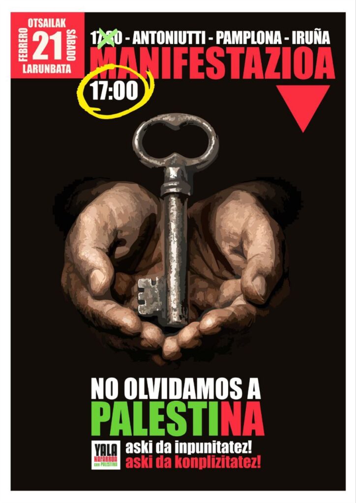 Yala Nafarroak otsailaren 21eko mobilzazioa iragarri du. Arratsaldeko 17:00ean Antoniutitik abiatuko da manifestazioa, Palestina jasaten ari den genozidioaren amaiera eskatzeko. Aurretik egindako mobilizazioak aipatu dituzte egindako agerraldian: “2025ean, Iruñean bakarrik 5 manifestazio egin genituen, 117 hitzaldi eta solasaldi, parlamentuan aurrera atera ziren 3 mozio aurkeztu genituen eta 80 udalek baino gehiagok onartzea lortu genuen. Kongresuetara joan ginen EHUn Bilbon, Bartzelonan, Madrilen, Vienan, Londresen, Atenasen. Jardunaldi juridikoak antolatu genituen NUPen eta lan instituzionala egin genuen Nafarroako udaletan erosketa etikoaren araudia aplikatzeko. Dabke talde bat ekarri genuen zuzenean Palestinatik eta gure geografiako hainbat tokitara eraman genuen.”