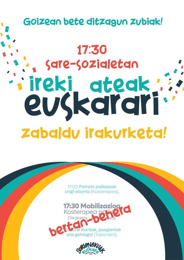 Bihar arratsalderako ematen duten eguraldi kaxkarra ikusita, arratsaldeko egitaraua eta herri mobilizazioa bertan-behera uztera behartuak gaude. Ekaitzak ez zigun utziko behar bezainbeste egitarauaz, eta euskararendako, euskaraz eta euskaragatik sortu nahi genuen momentu goxoaz gozatzen. Eta Sorionekuak hori ere bada, poztasuna, zirrara, irribarrea. Dena den, 17:30etan, herri mobilizazioa gauzatu behar genuen orduan, sare sozial ahalik eta gehienetan, mobilizazioko azken irakurketa partekatzea eta zabaltzea eskatzen diogu jendeari. Goazen, kanpoan ekaitza egin bitartean, gure etxeko goxotasunetik euskara zabaldu, mundura erakutsi eta hemen gaudela aldarrikatzera.